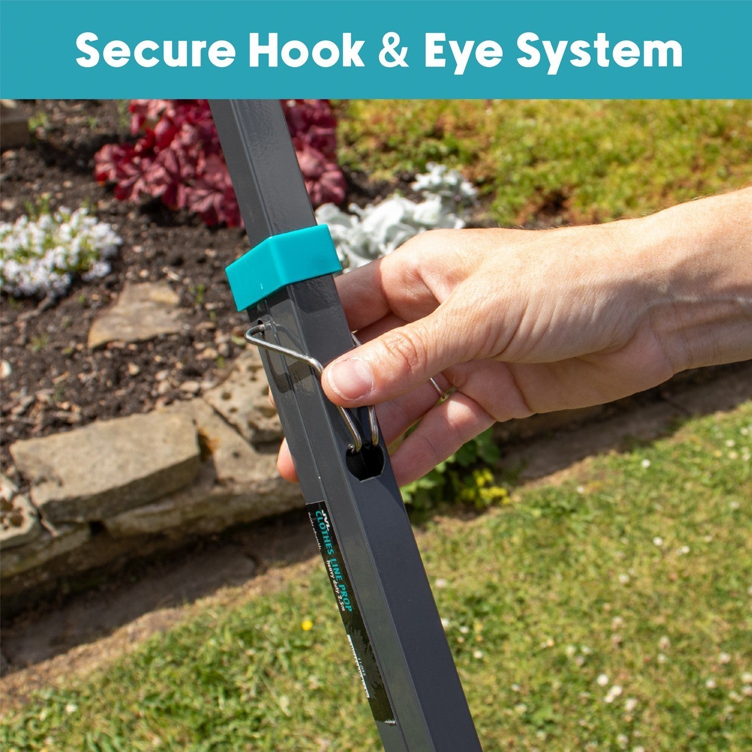 - The clothes prop extends with an easy a simply hook and eye system to lock in place