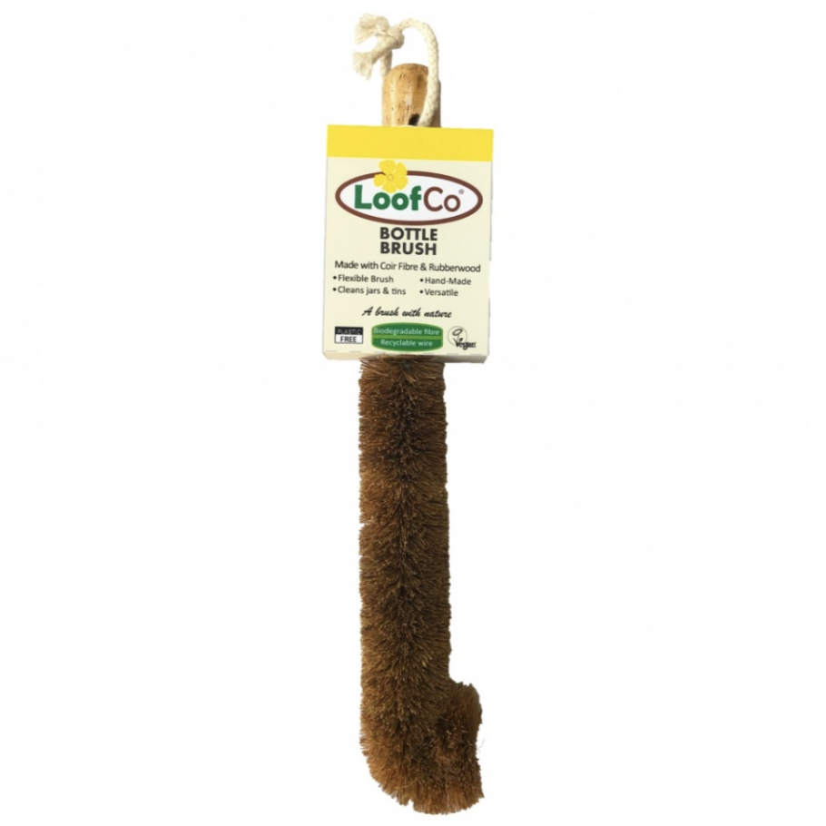 Plastic-free bottle brush is made from coir fibre twisted around a recyclable and rustproof metal core with an integrated hanging loop.