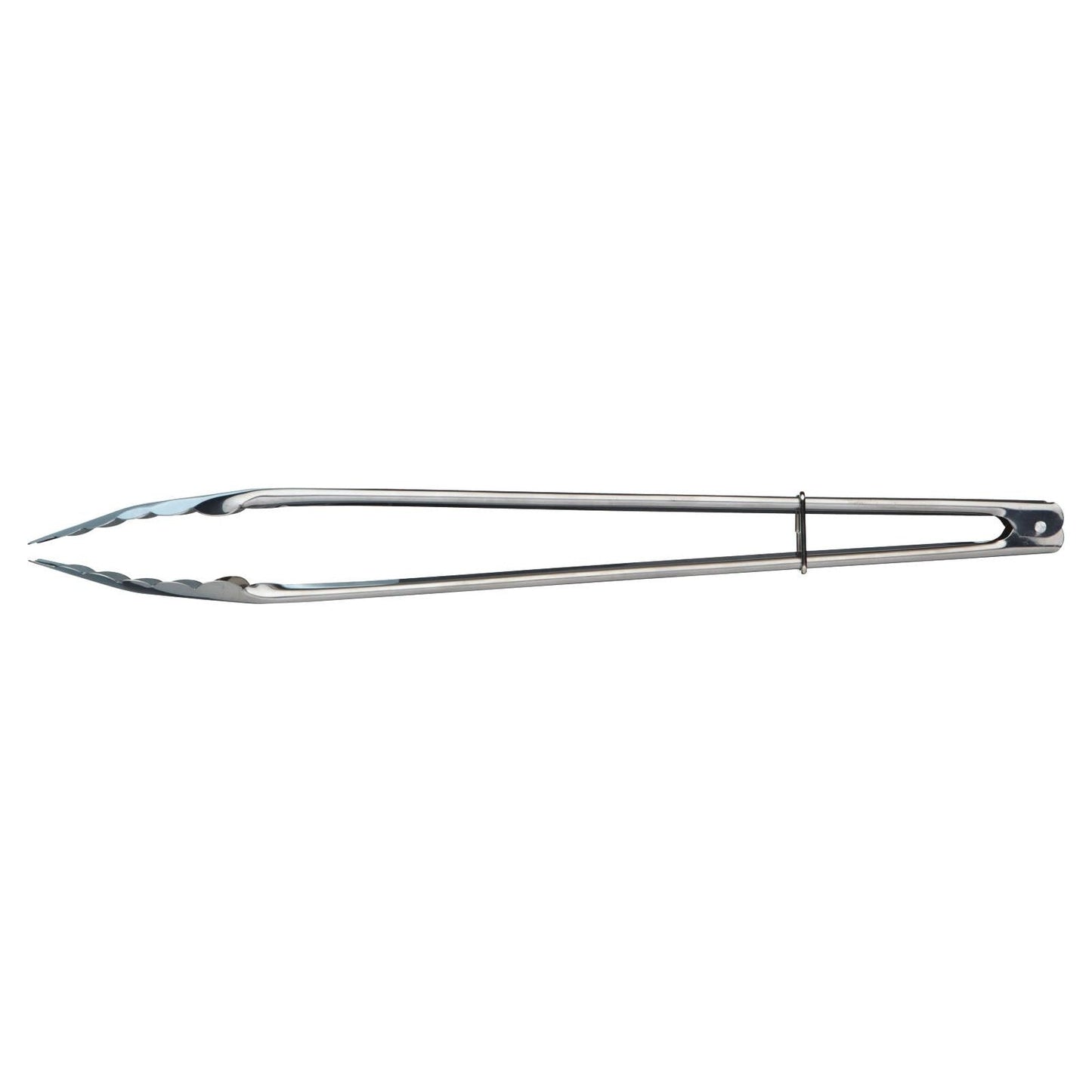 Simple style, large durable stainless steel Kitchen Craft tongs for hygienically and safely turning over and serving hot food from ovens, grills, pans, and barbecues. Features large shaped clasping plates for a secure hold on any item, and locking rings to secure both plates together for easy storage.