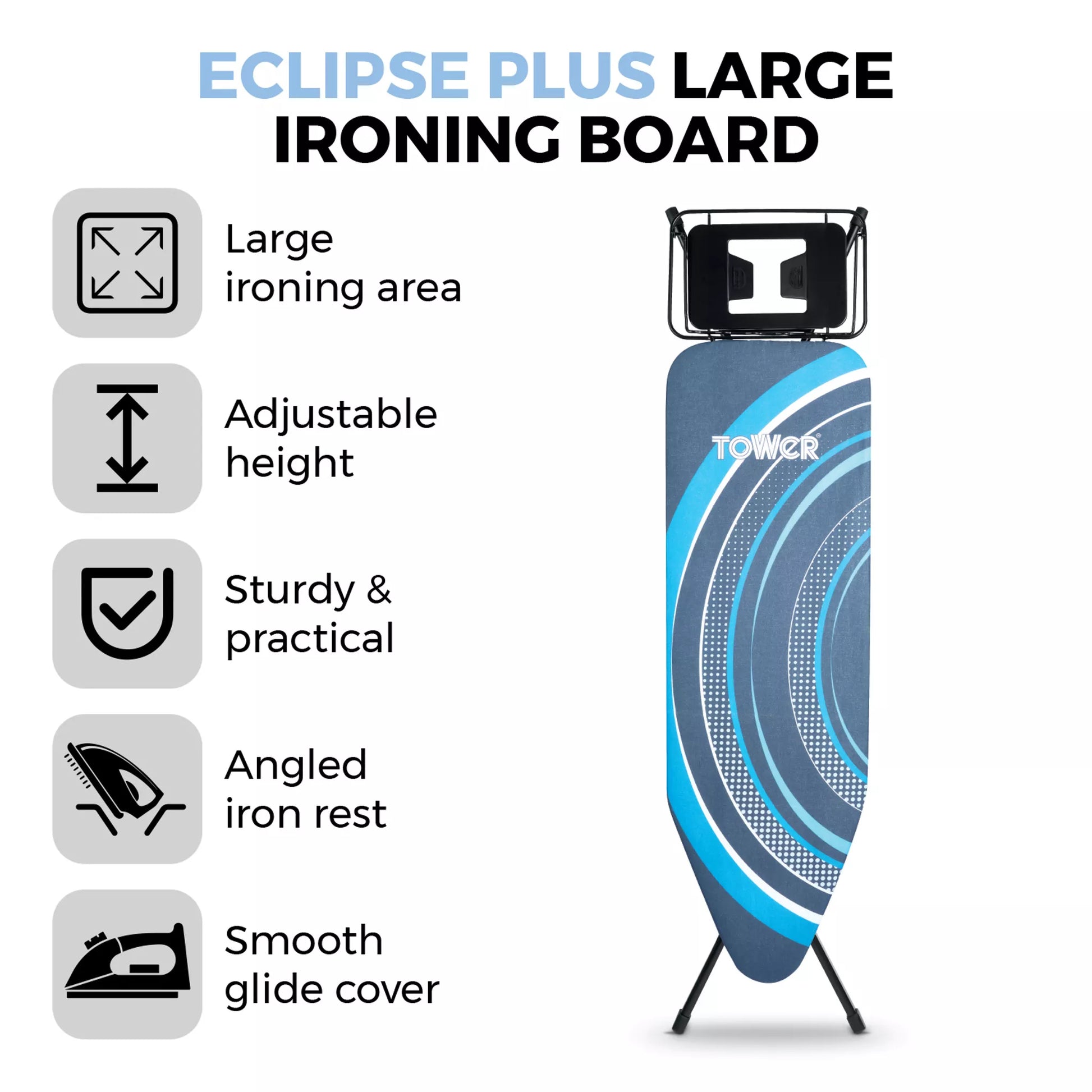 The large ironing board will let you save time and effort so you can complete any ironing task quickly and efficiently. The 122cm x 39cm ironing area can comfortably accommodate larger garments, so you can easily remove wrinkles and creases from shirts, trousers and bedding in no time