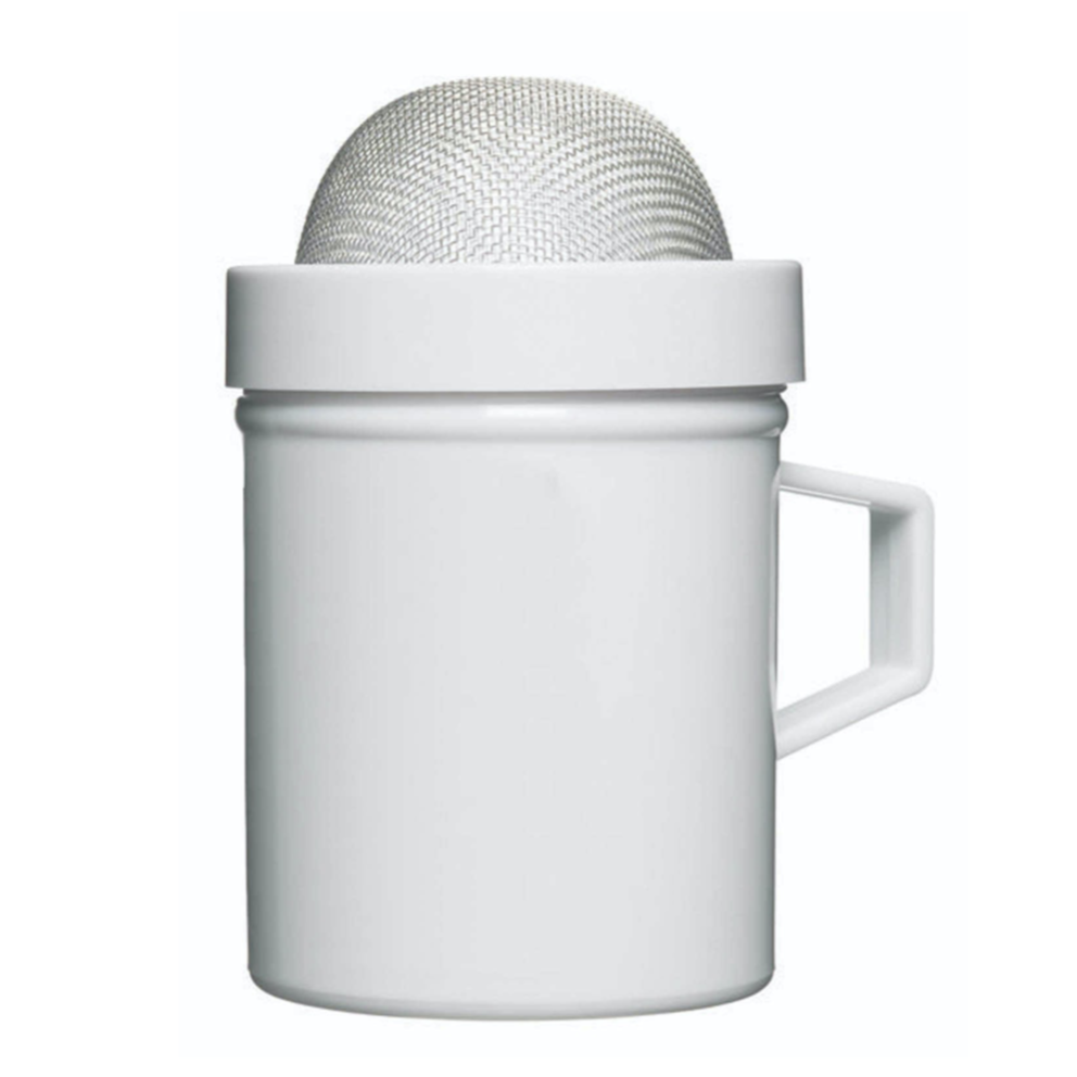Handy sifter for dusting, sieving and storing flour, icing sugar and cocoa powder. The plastic sifter features a side handle and screw on domed fine mesh gauze lid, which can be turned inside out for use as a liquid strainer.