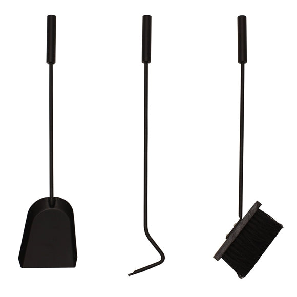 - Three piece classic fireside tool set, includes poker, brush and shovel held on a stand