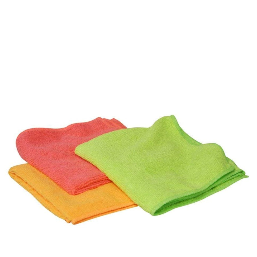 - Pack of 3 microfibre cloths - one of each colour (green, pink & orange)
