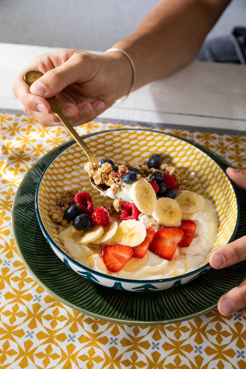 Add colour and charm to your dining with this vibrant stoneware bowl, crafted with a wide, shallow shape ideal for pasta, salads, noodles, stews, and more. Perfect for both everyday meals and entertaining. Featuring bold patterns and artistic detail, it suits both modern and eclectic tables. Microwave and dishwasher safe, this bowl combines style and practicality, an eye-catching addition to any kitchen collection.