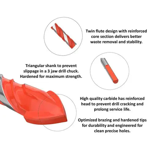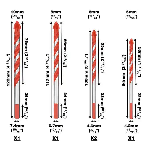 Pack contains: 5mm x 91mm (1), 6mm x 100mm (2), 8mm x 117mm (1) & 10mm x 122mm (1). Designed to drill through the toughest of materials such as Ceramic, Glass, Granite, Marble and Porcelain. In addition, they can also be used to drill through softer materials such as wood, brick and concrete. Used correctly these bits will give you a nice clean precise hole for you to fix in to securely. The professional grade Carbide tip is designed to penetrate the hardest material quickly and the double flute helps remove the waste material efficiently. The bit sizes supplied are suitable for all popular wall plug fixing solutions including red, brown, blue and grey plugs.